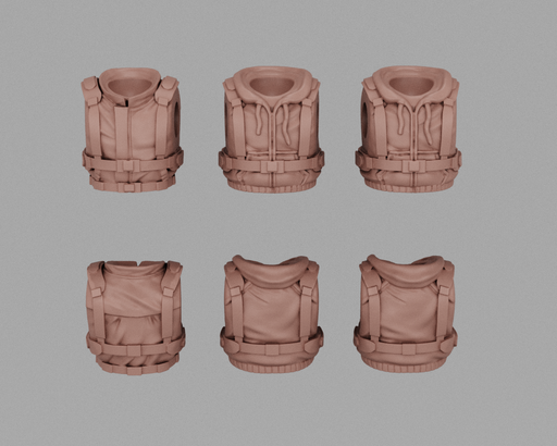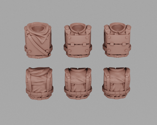 Original price $6.00 - Original price $6.00Original price$6.00$6.00 - $6.00Current price $6.00| /This kit contains 6 backpacks, 2 of each pictured design. Compatible with most 28mm Heroic scale humans. Bits designed by Anvil Digital Forge